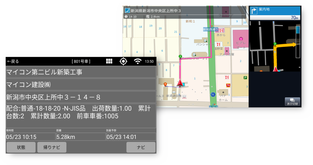 出荷管理システムと連動することにより担当者は出荷指令を指示するだけで、指令情報がミキサー車に搭載されるタブレットに送信され、運転手は積載商品と現場情報の確認ができます。