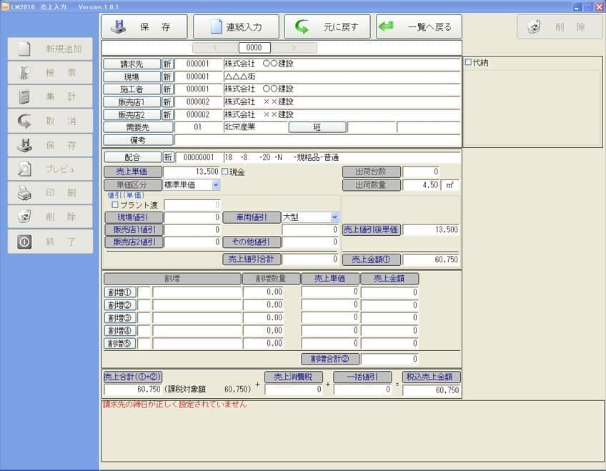 また空積料金・ポンプ料金・小型料金などの割増料がある場合は、割増料マスターに登録すれば売上入力の際にそのコードを入力するだけで、基本単価に割増料と割増名が追加できます。
