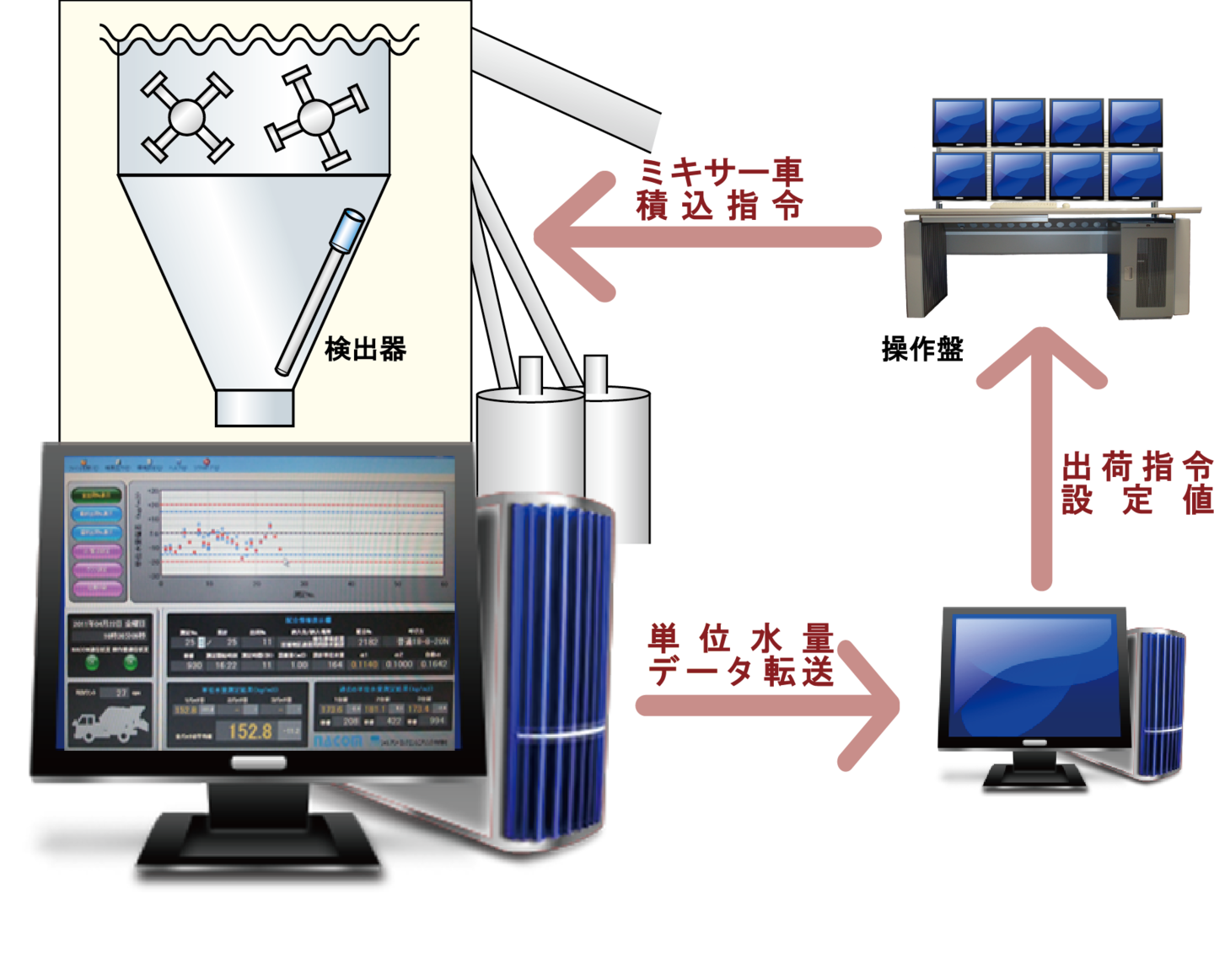 NACOMで測定した単位水量のデータをダイレクトに操作盤に送り、品質に問題がないか確認後、ミキサー車への積込指示を出します。