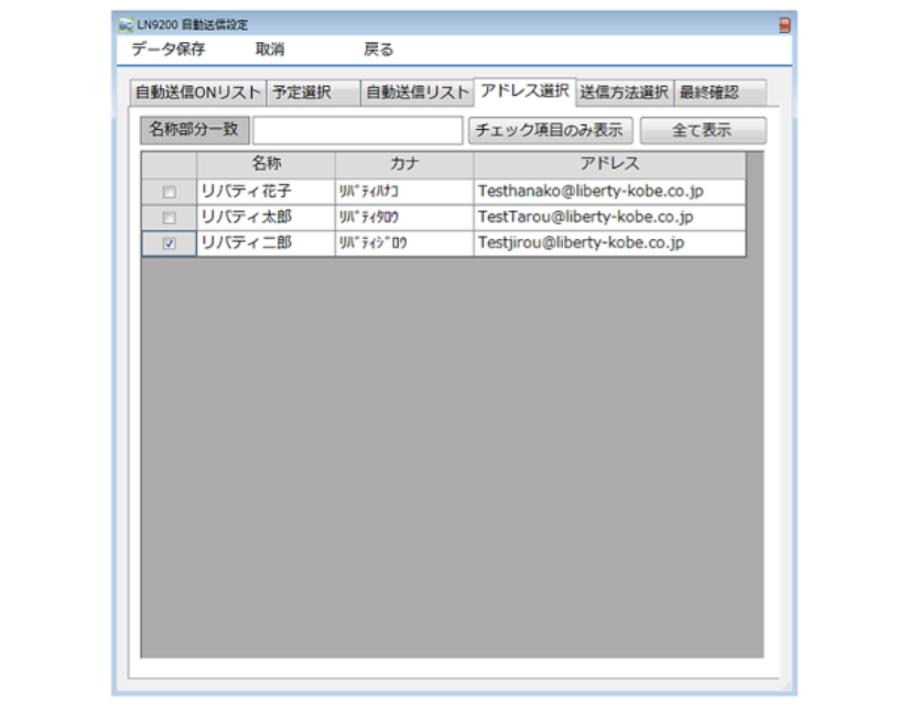 アドレス帳から送信先を設定します。毎回、複数の送信先に自動送信するという設定が基本ですが、個別メールの設定にも対応。状況によって使い分けていただけます。