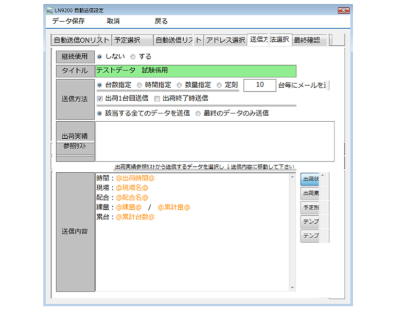 送信を何台毎、何分毎、あるいは何立米毎に行うか。出荷時間、配合、積載量などのうち、どのデータを送信するか。現場のニーズなどにより、細かく設定できます。